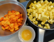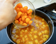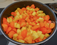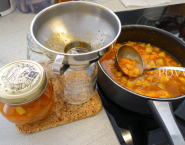 Zet de stukjes ananas met sinaasappelsap in de pot en breng aan de kook. Laat even inkoken en voeg 500 gram van abrikozen erbij. Voeg nu de suiker en kruiden erbij en kook tot puree begint verdikken. Voeg nu de kleinere hoeveelheid van abrikozen en laat koken tot de vruchten zacht zijn, maar niet uit elkaar vallen.