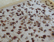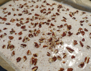 Pour the batter on a lined baking sheet and sprinkle with pistachios. Bake about 15 minutes at 356°F. Let it cool down and cut the dough custom and put into tart form.