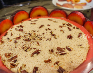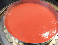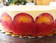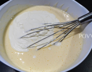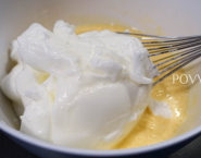 Pour the lukewarm juice to the egg yolks and stir with a whisk. Add the egg whites, pour the cream and stir until smooth. Pour the mousse on plums cream and leave the cake in the fridge for 2 hours.