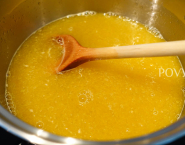 Pour the juice into a saucepan and put on fire. Cut the zest finely (or grate them) and add. Do this 100 grams of sugar and let it reduce to 2 dl.