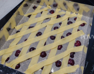 Roll the remaining dough in a little flour into a rectangle. Cut the strips and divide the cake in the tin. Klus an egg and brush the slices with it.