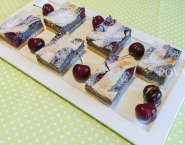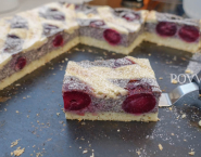 Roll out 2/3 of the dough in a baking pan 30×40 cm (the walls were best 3 cm deep). Prick with fork several holes in the bottom and sprinkle with breadcrumbs. Stir the pudding, the poppy seed mass, cream and 3 eggs together. Spread the mixture over the dough and divide the pitted cherries over.
