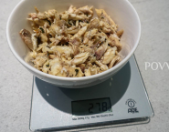 Bring to a boil over low heat, then leave to infuse for half an hour. Strain the fish stock but keep the big fish pieces aside. Let them cool down and pick the good bits of meat off. I like that 279 g of fish picked. Sift yet the rest of your fumet and ready!