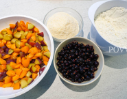 Make a dough ball and take 1/3 off. Spread 2/3 of the dough on a baking sheet while pressing the edges slightly. Divide then the fruit over the cake and sprinkle more crumbs from the remaining dough over the fruit.