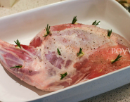 Was het vlees schoon en droog met keukenpapier. Kruid met zout en peper. Prik in het vlees met een mes en doe in de gaatjes partjes knoflook en enkele blaadjes rozemarijn. Plaats in een ovenschaal. Rooster 1 uur. Wikkel het vlees in aluminiumfolie. Zet 10 minuten apart.