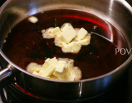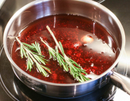 Kook het lamsfond 1/3 in met porto, het knoflook en de rozemarijn. Voeg het kooknat aan de saus toe. Giet de saus door een zeef. Voeg de boter al kloppende toe. Breng verder op smaak met zout en peper.