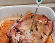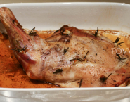Snijd het vlees in plakjes. Verdeel over de borden en lepel er wat rozemarijnjus over. Als bijlage kan je gestoomde groenten en gebakken krieltjes serveren.