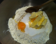 Spoon the flour on a work surface in circle. Place in the center of the circle the egg, butter, salt, sugar and vanilla. Mix all this briefly in a homogeneous dough. Wrap the dough in plastic wrap and let rest for several hours in the refrigerator.