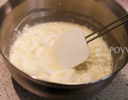 Pridaj mandľové mlieko a potom pomocou špatule primiešaj taliansku penu a do polotuha vyšľahanú šľahačku.