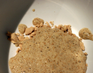 Put the flour and salt into a large bowl. Crumble the yeast into another bowl and add the sourdough plus three quarters of the water. Stir until well blended. Pour the liquid to the flour mixture and work it through together, providing as much water as necessary for a fairly firm dough.