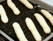 Turn the risen dough and place it again on a lightly dusted work surface. Divide the dough into 20 equal parts. Roll each piece by hand into a neat sausage about 16 cm long. Cover them with the plastic film and let them rise for about 15-30 minutes until rolls are twice as large.