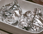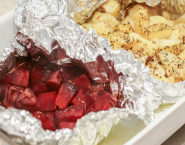 Peel the potatoes and red beet and cut into pieces. Grease two sheets of aluminium foil with olive oil and make the first sheet of a papillote red beet, salted and sprinkled with cumin and second papillote potatoes sprinkled with sea salt and thyme. Close the papillote and bake in preheated oven at 200°C for about an hour.