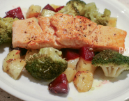 Serve the vegetables on preheated collar and put a piece of salmon on it.