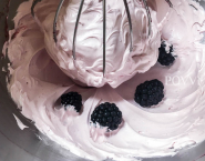 Medzitým v kuchynskom robote alebo šľahačom vyšľahaj bielok a 50 g cukru do hustej peny. Keď je hustá, prilievaj v tenkých prúdoch cukrový sirup. Keď pena začne zväčšovať objem, pridávaj po lyžiciach černicový situp/ prepasírované černice a šľahaj až do vychladnutia a zhustnutia peny.