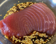 Pár hodín vopred daj marinovať tuniaka: všetky suroviny na marinádu spolu zmiešaj a tuniaka v nej najprv vyváľaj, potom ho zakry fóliou nechaj v chladničke až do použitia.