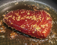 Kým sa zelenina pečie, priprav si tuniaka: Na horúcej panvici rozpáľ 10 g masla, spolu s 1 PL olivového oleja. Tuniaka vyber z marinády a z oboch strán ho prudko opeč. Vnútro nemá byť úplne prepečené.