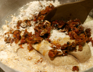 Zet het voordeeg op kamertemperatuur en voeg bovengenoemde ingrediënten toe, samen met de uitgelekte rozenbottelschillen.