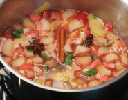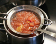 Snijd het fruit in kleine stukjes en doe samen met andere ingrediënten in een pan. Breng aan de kook en laat koken tot de groenten uit elkaar vallen. Zeef dan de massa. Laat de marinade daarna koken tot ze lichtjes verdikt (het moet vasthouden aan de onderkant van de lepel) zet van het vuur en houd ze warm. Na even afkoelen plaats de aardbeien in de voorbereide marinade en laat marineren tot gebruik.