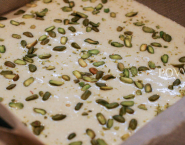 Giet het beslag op een met bakpapier beklede bakplaat en bestrooi met pistaches. Bak het deeg ongeveer 15 minuten op 180°C. Laat afkoelen.