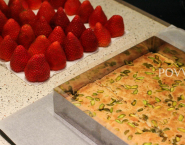 De taart smaakt ongelooflijk fris, lekker en de licht zurige smaak van rabarber gaat mooi in aanvulling met de zoete pistache dacquoise en gemarineerde aardbeien.