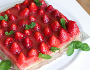 Schoon was en snij de rabarber en aardbeien in stukjes. Doe ze in de pot, voeg de citroensap, citroenschil, vlierbloesem honing → en breng aan de kook. Als het fruit schuimt, voeg de groenten mengsel en bak tot de vrucht is afgebroken, ongeveer 10-12 minuten. Met behulp van een handmixer pureer het fruit. Week de gelatine bladen in koud water tot ze zacht zijn. Meng ze nadien in de hete fruit en laat even afkoelen. Giet dan de crème op het deeg in de taart ring maar plaats nog niet in de koelkast.