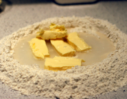 Doe de bloem in een cirkel op een werkblad. Strooi het zout langs de buitenkant van de bloem. Giet het water in het midden en doe daar ook 250 gram van boter bij. Vermeng dit alles langzaam met de bloem tot een homogeen deeg en laat hem onder plastiek 20 minuten rusten.