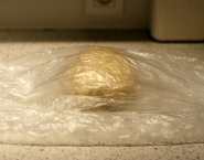 Tot slot wikkel het deeg in plasticfolie en als je hem niet onmiddellijk gaat in een taart bewerken, zet hem tet gebruik in de vriezer.