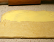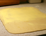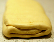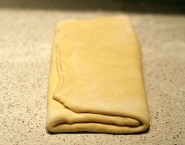Rol het deeg nu tot een vierkant van 8 mm dik. Smeer de resterende boter gelijk op twee derde van de rechthoek. Vouw het deeg naar het midden toe dicht, te beginnen met het deel zonder boter. Het is nu klaar om getoerd te worden.