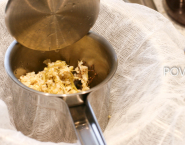 En ik kwam op het heilbrengend idee om – jawel – de aardappelpers te gebruiken. Ik heb de bloemen dus eerst bewerkt met citroen. De volgende dag heb ik ze met een lepel in de pers gebracht, en heb goed boven de neteldoek gedrukt. En het resultaat?
