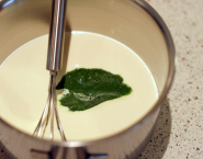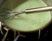 Breng de slagroom samen met de pistache pasta aan de kook. Giet over de chocolade in drie keer en meng samen tot alle stukken chocolade gesmolten zijn. Meng tot een zachte ganache met een klopper of mixer, zet hem in een luchtdicht recipiënt en laat een uur in de koelkast opstijven.