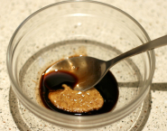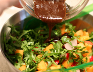 Meng de frambozenazijn en mosterd samen met olie. Breng op smaak met peper en zout en giet over de ingredienten in de kom.