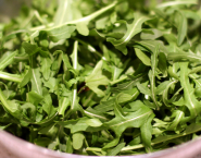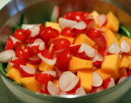 Was de rucola en doe ze in een kom. Halveer de meloen, verwijder de zaadjes en snijd in stukjes. Doe meloen samen met rucola. Was en snijd de radisjes in stukjes en doe ook samen met meloen en rucola. Meng alle ingredienten goed samen.
