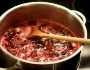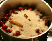 Combineer in de 5-6-liter steelpan cranberry’s, suiker, piment, kaneel, 2 1/3 kopjes water en 3/4 kop portwijn. Onder voortdurend roeren, breng alles aan de kook. Verlaag de temperatuur tot middelhoge en stoof de vruchten 12-14 minuten, of tot bijna alle veenbessen open zijn.