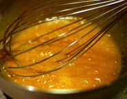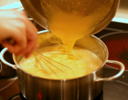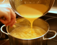 Klop de eidooiers in een kom op en voeg al kloppend de vanillemelk toe. Giet de melk weer in de pan en verwarm hem al roerend met een houten lepel op laag vuur tot de saus zo dik is dat hij op de elepel blijft hangen. Giet de saus in een koude schaal en roer de gekozen drank erdoor. Dek de bovenkant af met de plasticfolie, laat de saus afkoelen en hou hem in de koelkast.