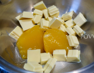 Verwarm de lemon curd in de kom boven de pot met heet water, voeg de witte chocolade bij en smelt ze er in. Voeg de stukjes koude boter, stuk voor stuk toe, totdat al boter soepel in de wrongel is opgenomen.