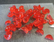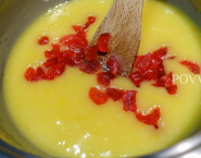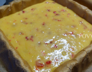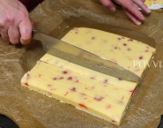 Meng tenslotte gebroken stukjes gekonfijte Bigarreau kersen onder de massa en giet de fudge in de voorbereiden afgekoelde taartvorm. Koel in de koelkast gedurende 2 uur.