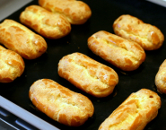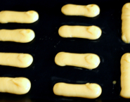 Bereid een soezendeeg en spuit staafjes van 11 cm lengte op een bakplaat. Zorg dat ze in voldoende afstand uit elkaar blijven. Om staafjes te spuiten gebruik een spuitzak met een groot glad spuitmondje. Bestrijk de staafjes met losgeklopt ei en je kan de bovenkant ook met vorkje zachtjes bestrijken.