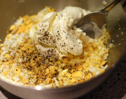 Rasp gekookte eieren fijn zoals appels. In Slowakije hebben we daarvoor een speciaal helpertje. Voeg de Philadelphia en de boter toe en breng op smaak met zout en peper.
