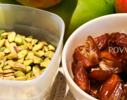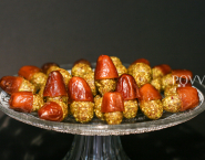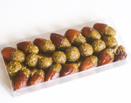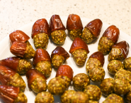 Snijd de stukjes dadels in tweën. Maak van pistache-dadel massa bolletjes met diameter van 2c munstuk. Druk de bolletjes van een kant wat dunner zodat je ze in een gehalveerde dadelstuk kan zetten. De dadelstukje vormt eigenlijk de mutsje van het eikeltruffel. Bol de rest van de pistache-dadelmassa gewone bolletjes.