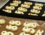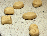 Knead the dough just after rising, divide into quarters and each quarter divide further into 8-10 pieces. Make each piece a sausage of 1.5 cm thick and 15 cm long and turn them into a letter S.