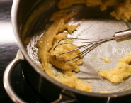 Melt the butter in a saucepan and add the flour. Make a roux and add 1 tablespoon of fish stock. Stay strong beat to clump counter. Let the sauce thicken. Pour the cream and season with pepper and very little salt. Remove from heat, add the egg yolk and beat on. Pour this sauce in salmon cooking, cook for 5 minutes over a very low heat without letting it boil.