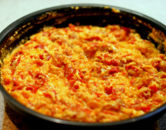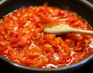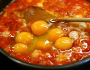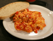Put the contents of the jar into the pan and bring to the boil. When lecho starts to boil add the eggs and stir constantly as scrambled eggs until it will be ready. Season with salt and serve immediately with fresh bread or bread rolls.