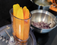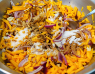 Peel the onions, cut into two and cut into strips. Add them to the pumpkin.