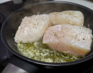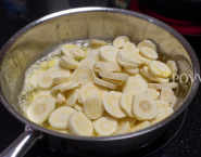 While the fish is baking, heat a small piece of butter in a smaller pan and fry sliced chervil root very briefly, sprinkled with a few drops of lemon juice.