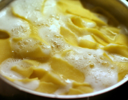 In meanwhile, cook the corn papardelle in boiling salted water. Spoon the papardelle ca.30 seconds after they come to the surface carefully from the cooking water. Add the pasta to the skillet with the sauce.
