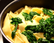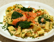 Tasty Italian corn papardelle with spinach and smoked salmon.