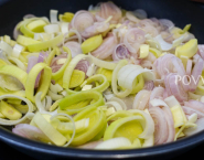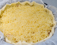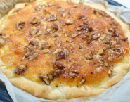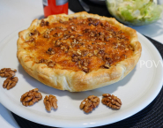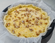 Grease a quiche mould with butter and cover them with puff pastry. Put the fried shallots and leek into the pie crust and sprinkle them with grated Gruyère cheese and walnuts.