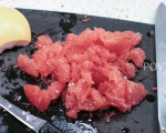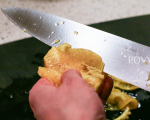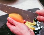 - Put the fruit on the side and cut the peel of with a sharp knife, so you only see flesh without membrane – see the picture. Try not to cut deep into the flesh so you get lovely wedges .