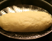 Put the dough after rising to the surface and knead it a bit. Cut into two pieces, and shape each piece a dumpling. Let the dumplings rise for another 20 minutes on the worksheet. Put the water in the pot and put in a steam network. Wipe the steam net with 1 tbsp oil so the dumplings will not stick. At the bottom of the steam network