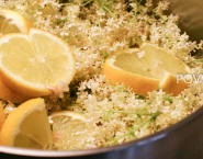 Wash elderberry flower, lemon or orange. Sliced lemon and orange. Let cook everything except sugar for 20 minutes and let stand for 24 hours.